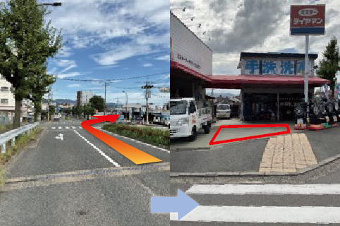 交差点曲がるとすぐに駐車場入り口があります。