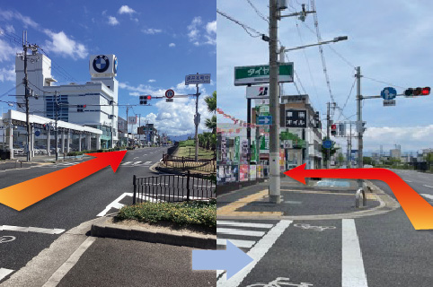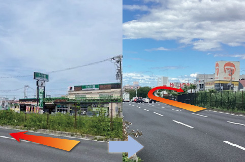 左手にロイヤルホームセンターさんが見えて参りますので、ロイヤルホームセンターさんを越えてレクサスさんがある信号をUターンすると入りやすいです。